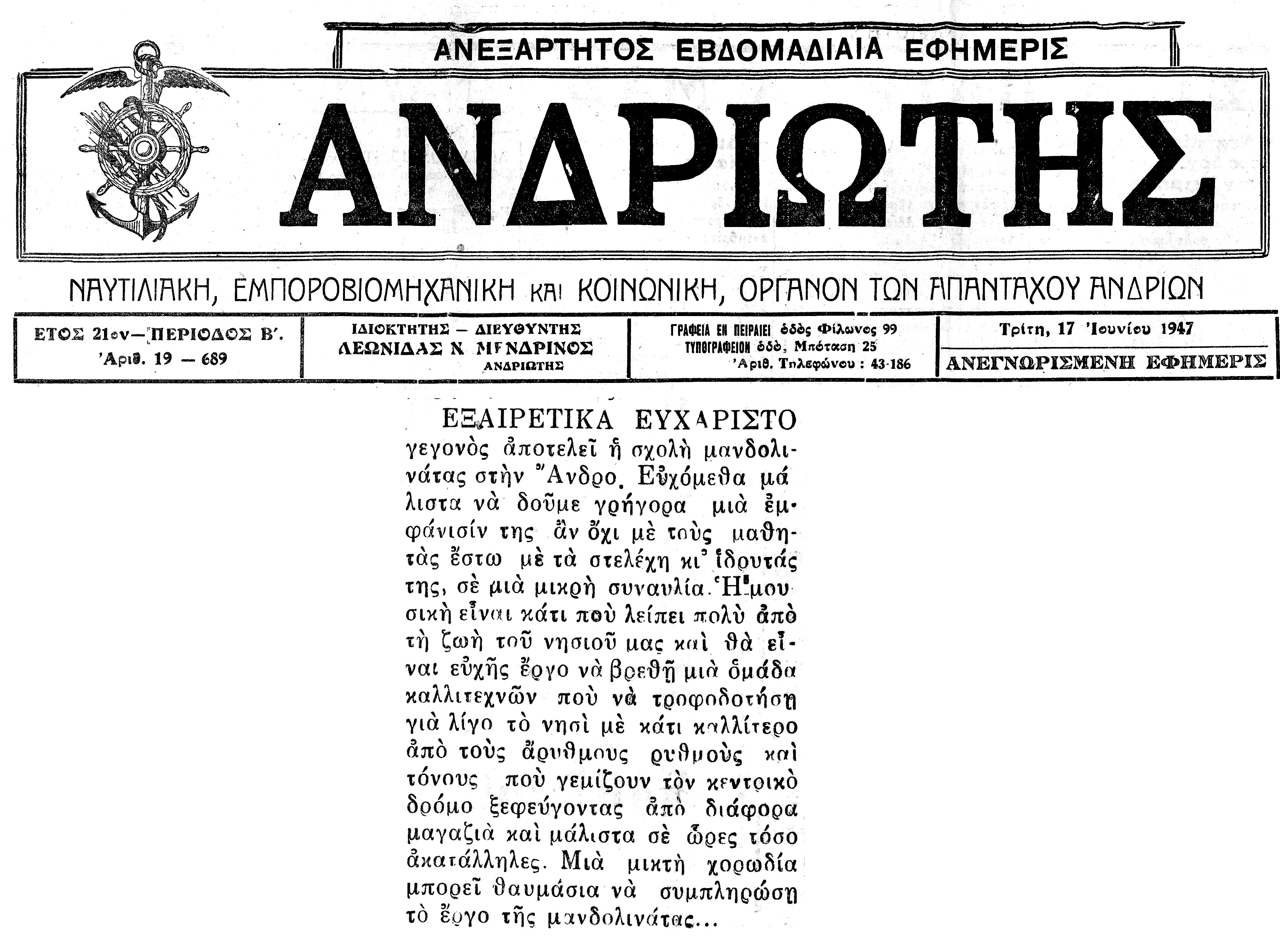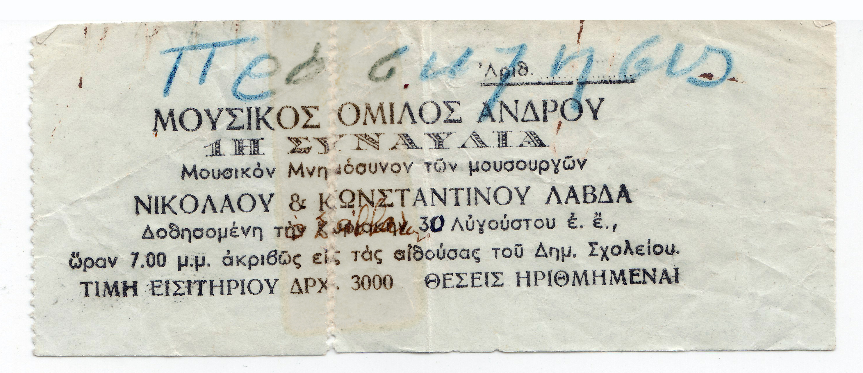 1η Συναυλία τής Ορχήστρας και τών Χορωδιών τού Μουσικού Ομίλου Άνδρου, υπό τήν διεύθυνσιν τού κ. Αντωνίου Κ. Λάβδα. Εις μνήμην τών ιδρυτών τής “Αθηναϊκής Μανδολινάτας” αδελφών Ν. και Κ. Λάβδα. 30 Αυγούστου 1947